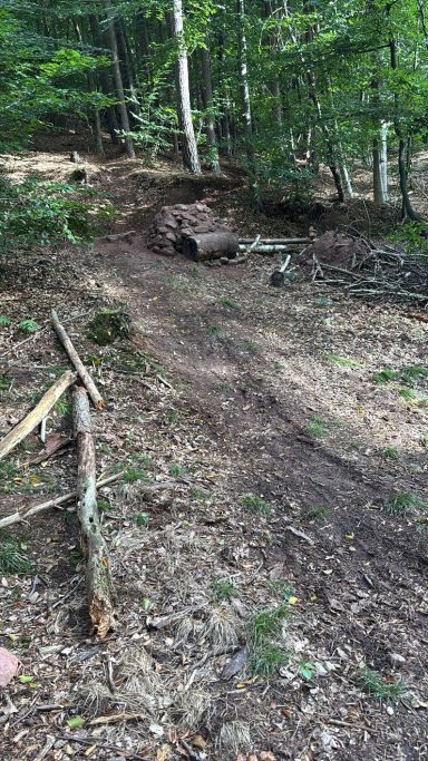 Guter technischer Verlauf am Einstieg durch den Jungwald mit kleineren Steps; dann schwunghafter Übergang in einen breiten Hohlweg (oberhalb des Neugässner Weg) durch den schönen Buchen-Hochwald mit Seitenwechseln und schwungvollen Anliegern; endet im sog. Steinbruch bzw. mittlerer Teil der Gasversorgungsleitung. Von hier aus geht es über den alten Spitzensteinweg zum nächsten Trail -> Spitzenstein Trail