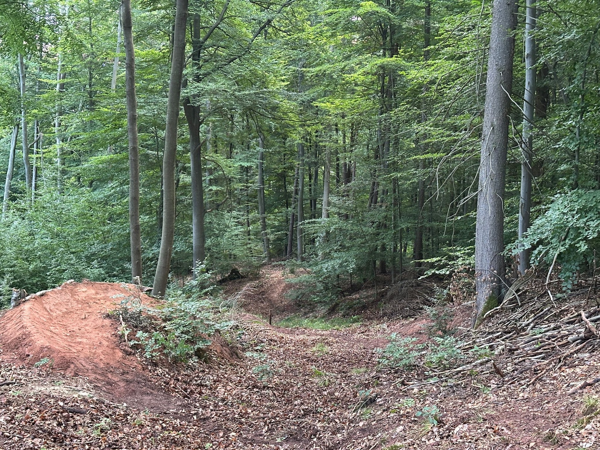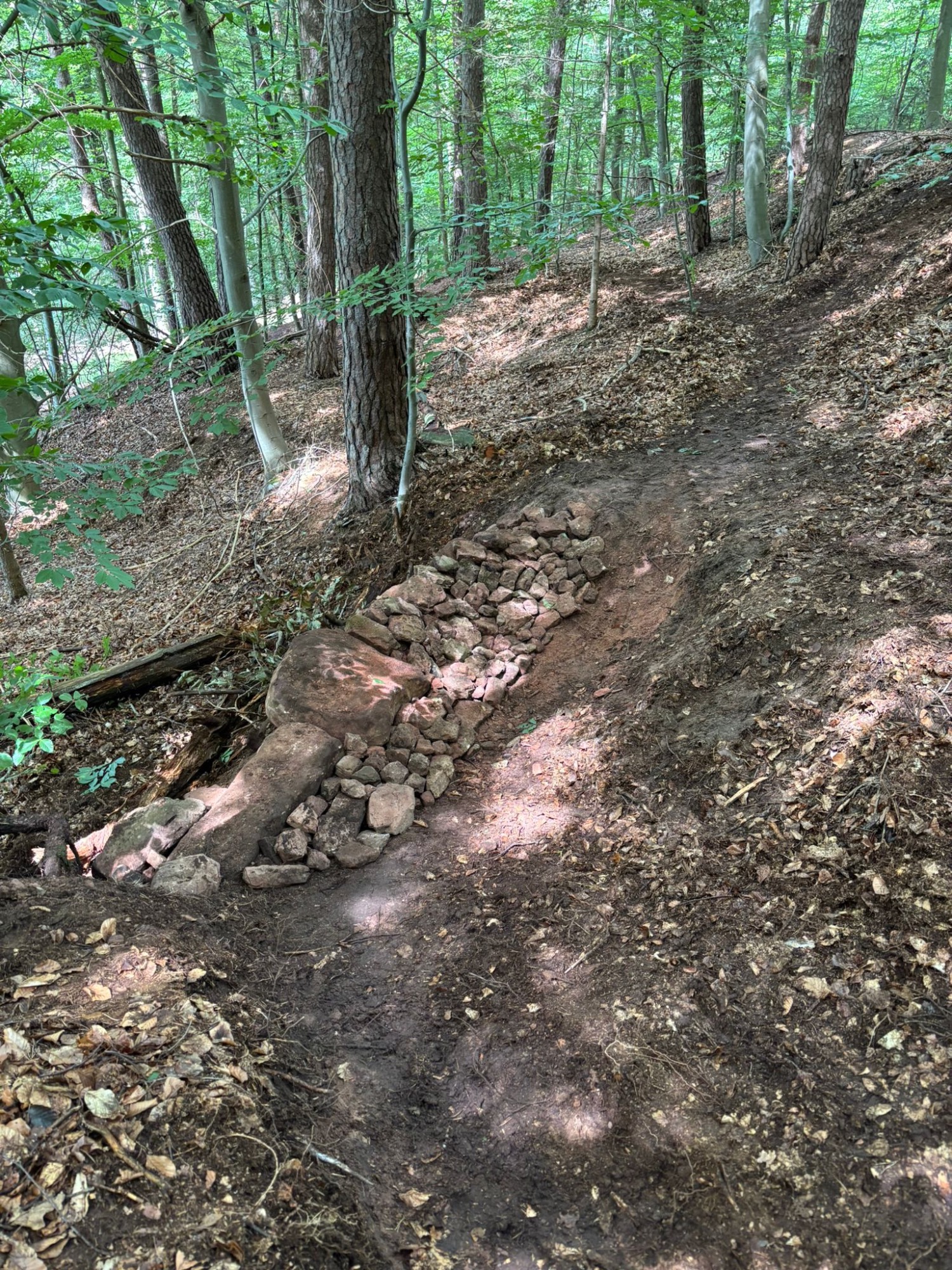 Guter technischer Verlauf am Einstieg durch den Jungwald mit kleineren Steps; dann schwunghafter Übergang in einen breiten Hohlweg (oberhalb des Neugässner Weg) durch den schönen Buchen-Hochwald mit Seitenwechseln und schwungvollen Anliegern; endet im sog. Steinbruch bzw. mittlerer Teil der Gasversorgungsleitung. Von hier aus geht es über den alten Spitzensteinweg zum nächsten Trail -> Spitzenstein Trail